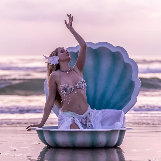 Each of her handmade costumes is a living sculpture carefully crafted to enchant the senses and amplify the soul of her performance. Her costuming is crafted to transport the viewer to the world of her characters through their attention to detail and commitment to creating otherworldly experiences. Additionally Chaosmic can offer sculptural elements to create a world for your performance such as clam shells, altars and backdrops.